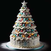 Ein atemberaubender Weihnachtsbaumkuchen, sorgfältig dekoriert mit weißem Zuckerguss, bunten Zuckerornamenten und zarten Schneeflocken aus Zucker. Die Torte ist mit kleinen Lichtern verziert, die der festlichen Kreation einen magischen Glanz verleihen.