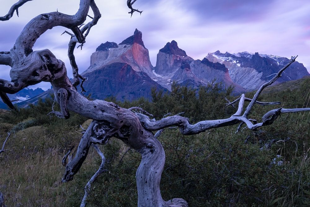 Sonnenaufgang im Torres del Paine National Park im Süden Chiles. Wir sahen viele solcher (toten oder fast toten) Bäume. Sie bildeten einen schönen Vordergrund für die Berge von Torres del Paine.