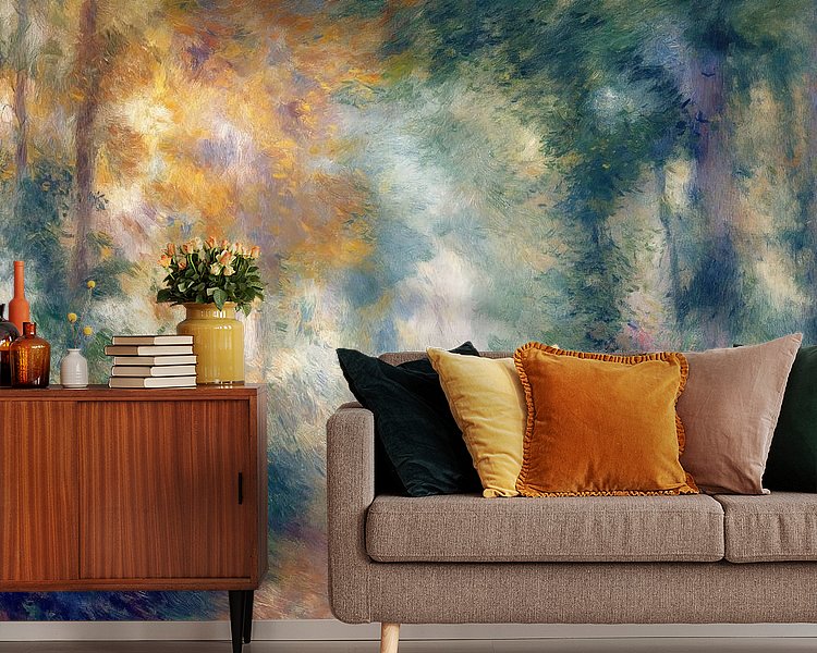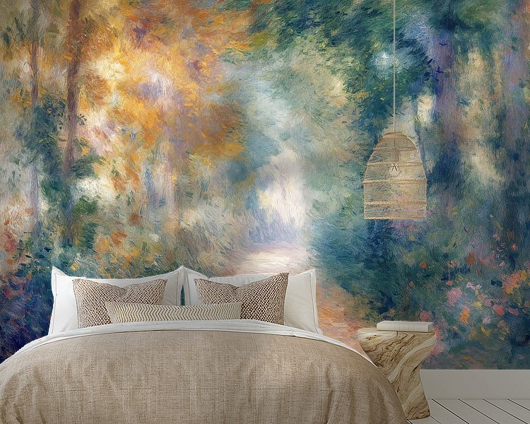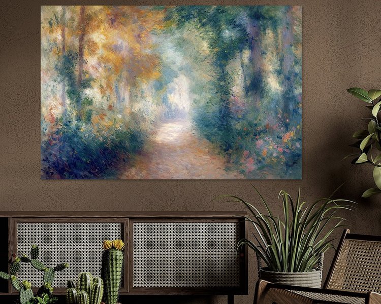 Ein verträumtes, impressionistisches Gemälde eines gewundenen Waldweges, umgeben von einer sanften, geheimnisvollen Atmosphäre. Die Komposition wird von warmen herbstlichen Gold- und Orangetönen dominiert, die mit kühlen Grün- und Blautönen verschmelzen. Der Weg verliert sich in nebliger Ferne, gesäumt von üppiger Vegetation, die mit lockeren Pinselstrichen dargestellt ist und eine ätherische, fast märchenhafte Atmosphäre schafft.