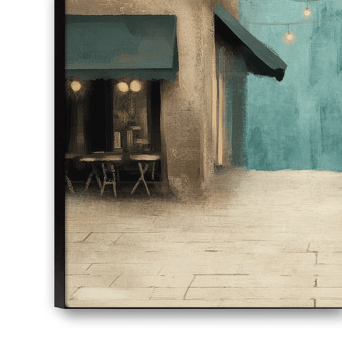 Ein warmer Sommerabend, ein stimmungsvolles Bild einer mit Lichtern beleuchteten Straße und eines Cafés an der Ecke. Wie man es zum Beispiel in Frankreich und Italien sieht.