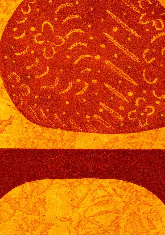 Ein schöner Druck in warmen Farben mit einer eigenen Symbolik. Die untere Form ist ein Tor, das den Zugang zur Gemütlichkeit ermöglicht. Gemeinsam Kaffee oder Tee trinken in einem warmen Haus, in dem man sich willkommen fühlt.