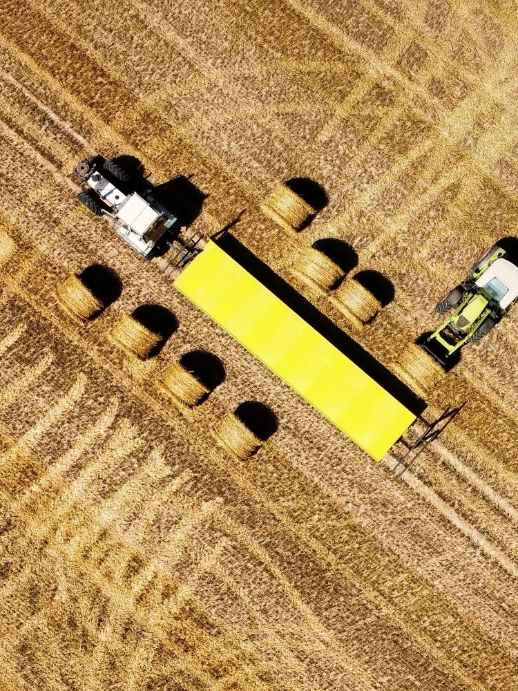 Diese Drohnenaufnahme zeigt eine landwirtschaftliche Szene südlich von Arras (Frankreich) in vollem Gange: Ein Frontlader-Traktor stapelt Strohballen auf einen Wagen. Die runden Strohballen werden aus Pflanzenstängeln mit verbrauchten Ähren gepresst, die nach dem Mähen des Getreides auf dem Land zurückbleiben.