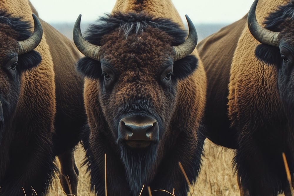 Dieses Bild zeigt drei beeindruckende Bisons, die direkt in die Linse schauen. Stolz stehen sie mit ihren vollen Körpern im Bild, jeder mit einer kraftvollen Erscheinung. Die Bisons haben ein robustes und massives Erscheinungsbild, ihr dickes Fell und ihre kräftigen Hörner machen deutlich, dass sie die Herrscher über die weite Landschaft sind. Ihre scharfen Blicke und ihre imposante Haltung vermitteln ein Gefühl von Macht und Abenteuer. Dieses Bild fängt die unbestreitbare Schönheit dieser großen Tiere ein und bringt einen Hauch von Wildnis in Ihren Raum. Es ist, als ob Sie einen Moment aus ihrer Welt entnommen hätten, der nun Ihre Wände schmückt.