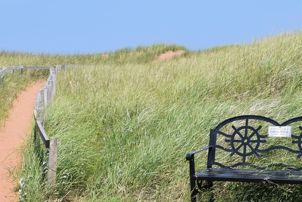 Eine Bank am Eingang des Wanderwegs, Prince Edward Island, Kanada
