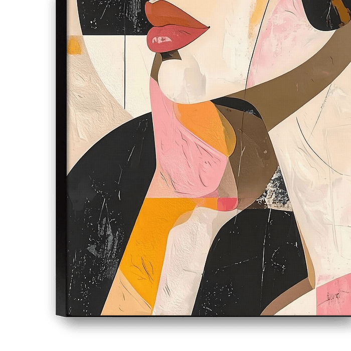 Figuratives Kunstwerk einer Frau mit einer großen rosa Blume im Haar. Stilvolle und farbenfrohe Arbeit in rosa, gelben, beigen und goldbraunen Tönen.