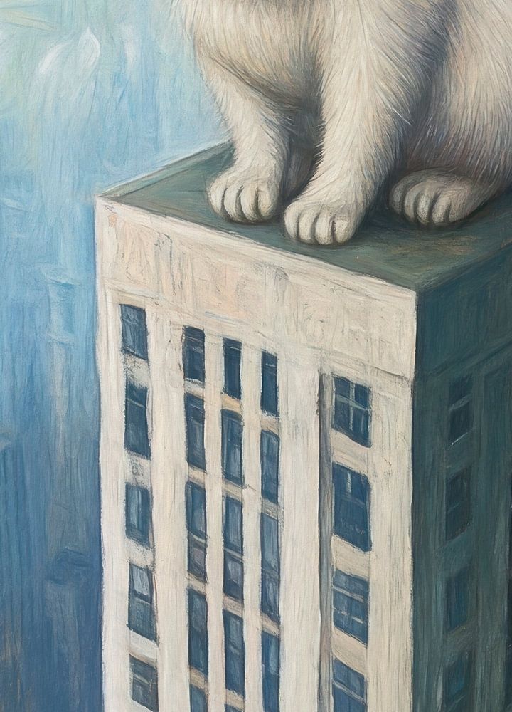 Eine große weiße Katze mit auffallend blauen Augen sitzt auf einem Wolkenkratzer und blickt über die Stadtlandschaft. Die Perspektive vereint Verspieltheit und Surrealismus.