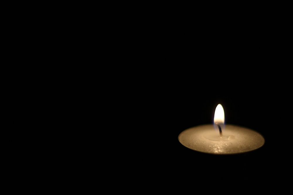Das Bild zeigt eine Kerze mit Flamme, deren Reflexion teilweise auf der Oberfläche sichtbar ist, auf der sie liegt. Der Rest ist ein schwarzer Hintergrund. Es ist ein einfaches Foto mit viel Tiefe und Gefühl. Die Kerze als Symbol für das Leben, das da ist, und der Hintergrund, der die ganze Kraft in nur eine Kerze investiert.