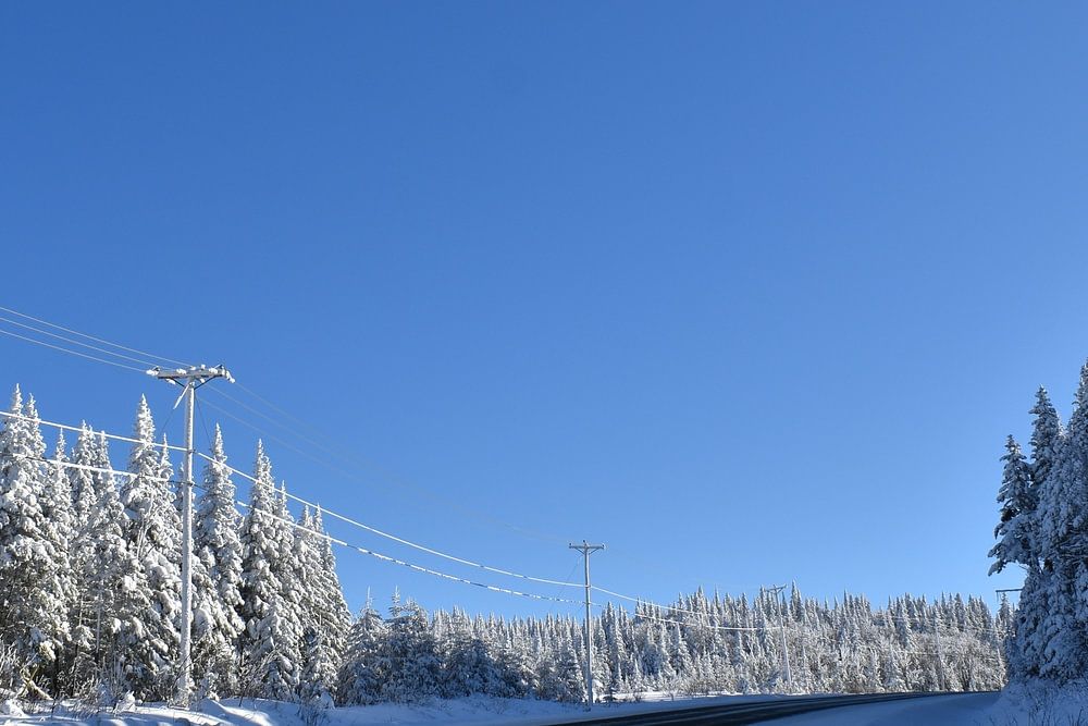 Eine Landstraße im Winter unter blauem Himmel, Quebec, Kanada