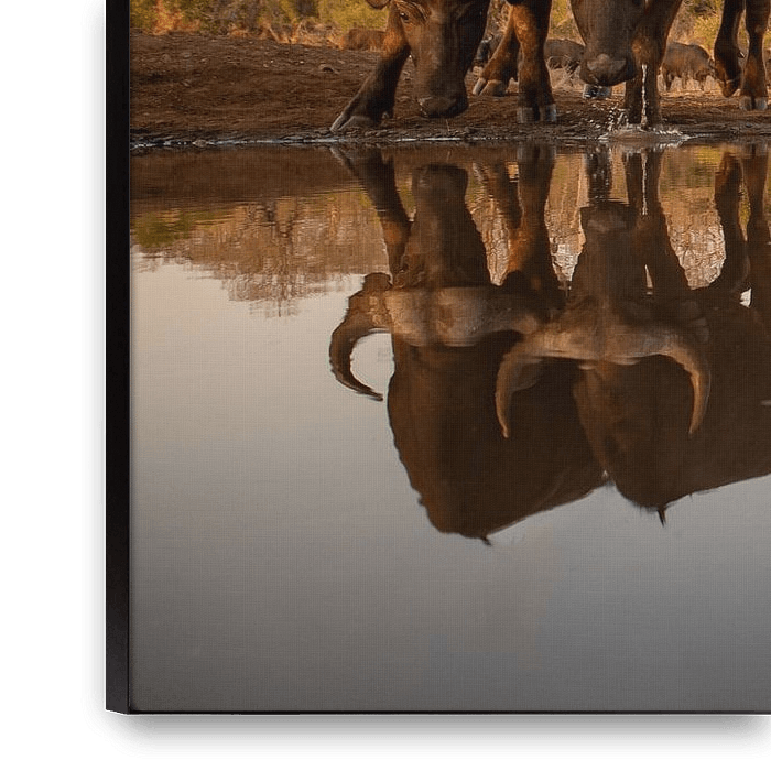Bestelle das Foto Eine Nashornmutter und ihr Baby treffen zwei Kaffernbüffel an einer Wasserstelle von Peter van Dam als Reproduktion auf Leinwand, Alu-Dibond, als Poster, Fototapete oder Acrylglasbild.