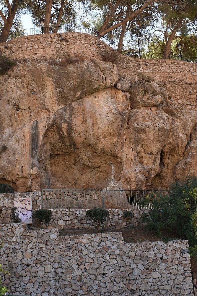 Eine Parkbank unter einem Felsen, Pueblo, Benalmadean, Malaga Spanien