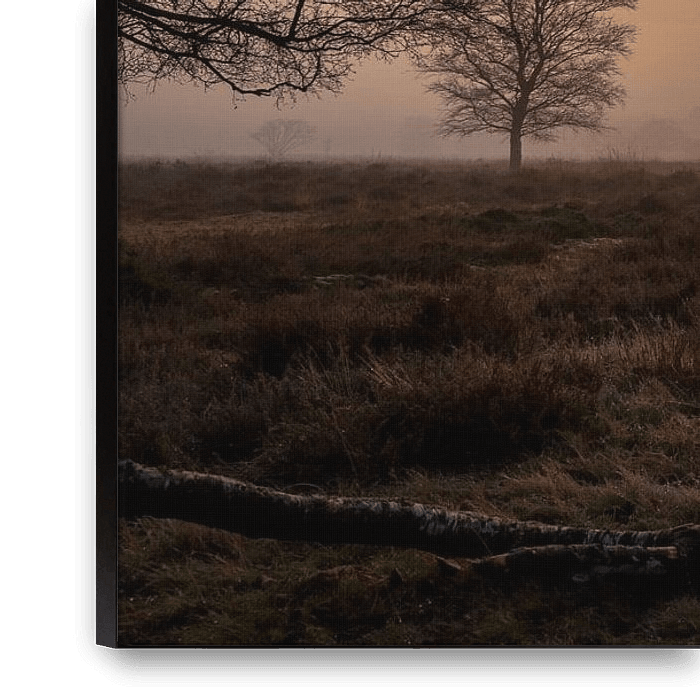 Ein abgestorbener Baumstamm links im Vordergrund führt Sie nach rechts auf dem Weg zu dem kleinen Baum mit den kapriziösen Ästen. Dazwischen scheint die Sonne undeutlich durch den Nebel, während links ein Schwarm Wildgänse ins Bild fliegt.