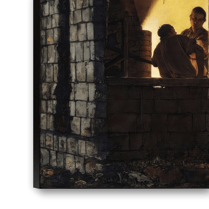Die Szenerie ist symbolträchtig. Eine zeitgenössische Schmiede ist direkt in die Ruinen einer gotischen Kirche gebaut, deren mondbeschienener Bogen sich im Hintergrund abzeichnet. Diese Komposition schafft einen tiefen Kontrast zwischen der verblassenden, spirituellen Welt der Vergangenheit und der aufstrebenden, industriellen Macht der Gegenwart. Die wichtigste Lichtquelle der Szene ist nicht der Mond, sondern das glühende, weißglühende Eisen, das in der Mitte der Werkstatt geschmiedet wird. Dieses brillante, von Menschenhand geschaffene Licht strahlt nach außen und beleuchtet die Figuren des Schmieds und seiner Familie in einem heroischen Glanz, der ihre Arbeit würdig erscheinen lässt.