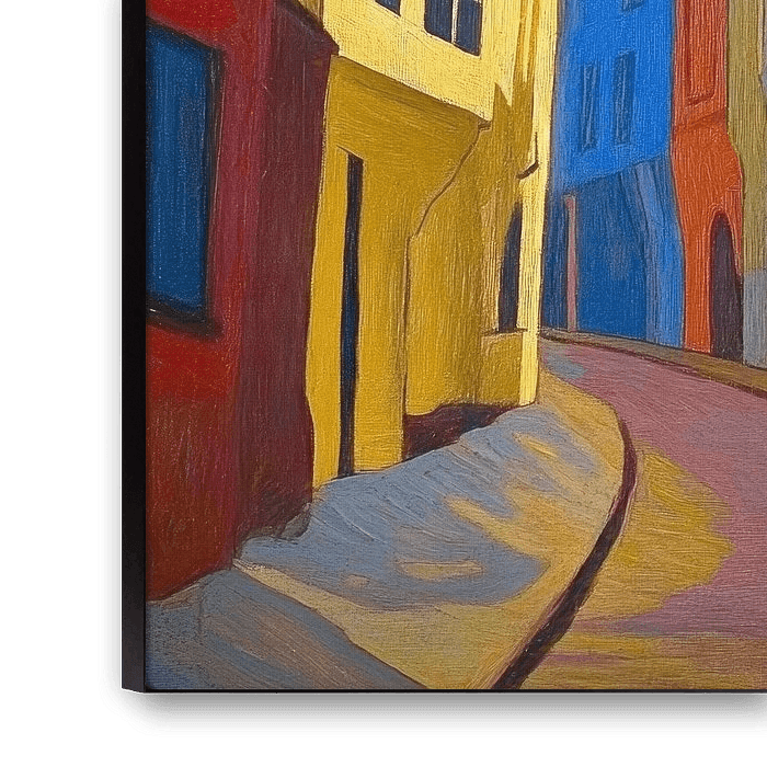 Eine schmale Straße schlängelt sich sanft zwischen einer Reihe farbenfroher Gebäude hindurch, die jeweils in kräftigen, auffälligen Farbtönen gestrichen sind. Das Zusammenspiel von Licht und Schatten verleiht der Szene Tiefe und schafft eine lebendige, beschwingte Atmosphäre.