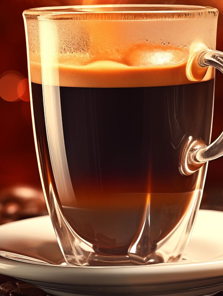 Nahaufnahme einer dampfenden, frisch gebrühten Tasse Kaffee in einem Glas.