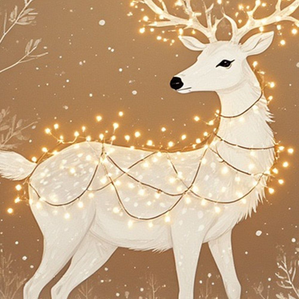 ein weihnachtliches Bild eines Rentiers mit Weihnachtslichtern um sein Geweih, das magisch im Schnee zwischen Büschen und Bäumen auf einem weiß-beige-braunen Hintergrund auf dem Boden steht.