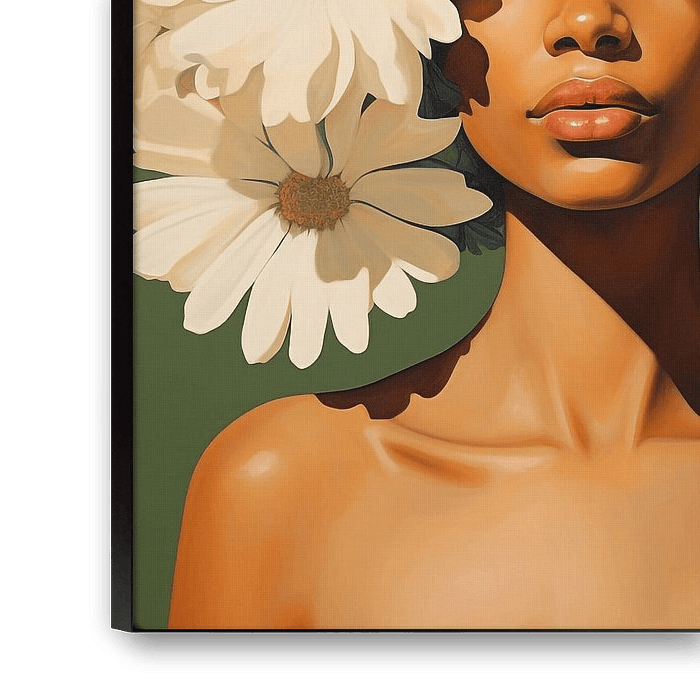 Dieses bezaubernde Kunstwerk erweckt ein schwarzes Mädchen mit leuchtend gelben Gänseblümchen auf dem Kopf zum Leben, in einem von Dunkelgrün und Weiß, Weiß und Beige inspirierten Stil. Das Gemälde zeigt komplizierte und zarte Blumen- und Gartenbilder, die ein Gefühl der Freude und des Optimismus ausstrahlen.