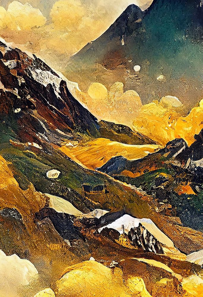 Ein farbenfrohes digitales Gemälde einer alpinen Berglandschaft mit dem Matterhorn von Gustav Klimt. Dieses Werk ist von den Formen und der Farbpalette von "The Kiss" inspiriert. Das Werk verleiht Ihrem Interieur ein warmes und klassisches Aussehen!