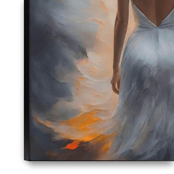 Entdecken Sie das Geheimnis und den Zauber dieses wunderschönen Gemäldes, das eine Frau in ihrer ganzen anmutigen Schlichtheit einfängt. In diesem digitalen Meisterwerk, das mit der reichen Textur von Ölfarbe und einer In-Pasto-Technik geschaffen wurde, sehen Sie eine Frau von hinten, deren elegantes Kleid in einem Farbenspiel erstrahlt…