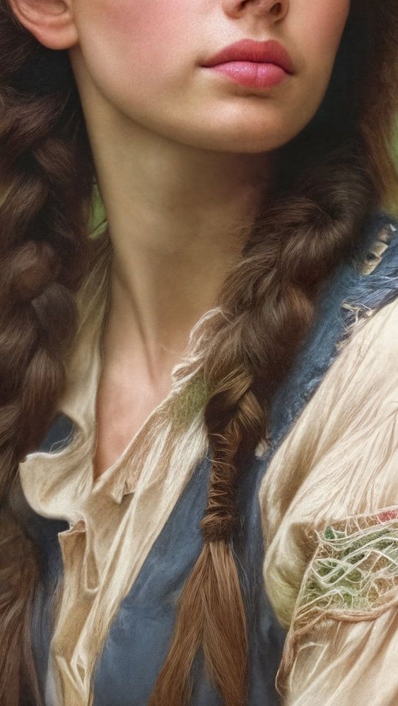 Eine junge Frau, eine gemalte Illustration, mit einem weichen, dunstigen Hintergrund aus gedämpften Grün- und Beigetönen. Die Beleuchtung lässt auf eine weiche, diffuse Lichtquelle schließen. Das Porträt wird von der Brust aus betrachtet, und die Person steht im Mittelpunkt des Bildes. Der Gesamtstil und die Stimmung vermitteln ein Gefühl von Romantik und Heiterkeit.