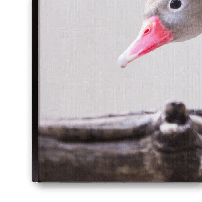 Eine neugierige pfeifende Ente mit roter Feder schaut von einem Zweig herunterEine neugierige pfeifende Ente mit roter Feder schaut von einem Zweig herunter