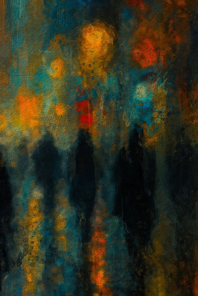 Dieses Gemälde basiert auf meinen eigenen Fotografien, die ich bei einem abendlichen Spaziergang durch die Stadt im Regen aufgenommen habe. Die Bilder von nassen Straßen, schimmernden Reflexionen und verschwommenen Figuren inspirierten mich zu dieser abstrakten Darstellung des Stadtlebens.