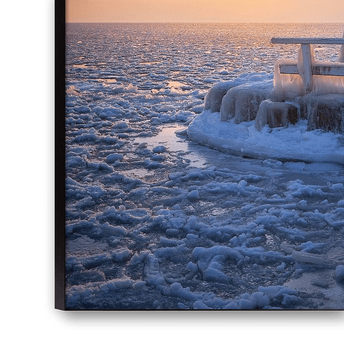 Gefrorene Gerüste mit gefrorenen Dukaten auf dem Afsluitdijk bei Sonnenaufgang. Das Ijsselmeer ist vollständig mit Eis bedeckt. Der Himmel ist blau und die Sonne scheint.