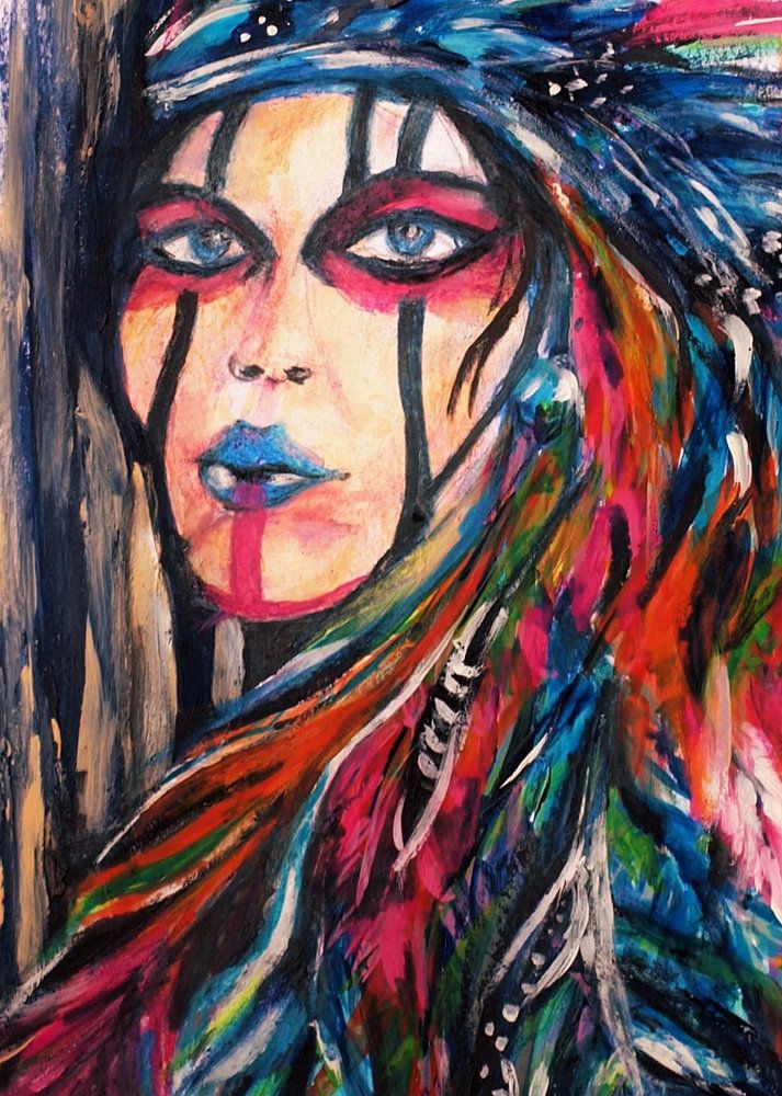 Acrylgemälde einer Indianerin mit ihrem farbenfrohen schönen Federkopfschmuck. Ihr Gesicht ist bemalt und sie blickt stolz auf ihre Welt. Indianer sind ein in Amerika lebender Volksstamm.