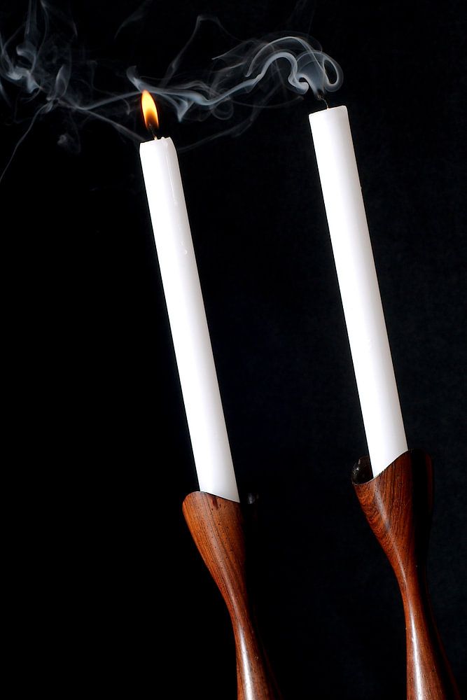Zwei Kerzen auf einem braunen Halter leuchten hell gegen den dunklen Hintergrund. Eine Kerze brennt. Der Rauch der anderen Kerze windet in die Luft.