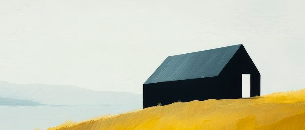 Ein einsames, schwarzes Haus thront majestätisch über sanften Hügellandschaften, umgeben von goldenem Gras, das im Wind tanzt. Die ruhige Wasserfläche reflektiert die sanften Töne des Himmels. Diese harmonische Komposition bringt Ruhe ins Wohnzimmer und lädt zu entspannten Stunden ein. Ein perfektes Element für eine Oase der Gelassenheit.