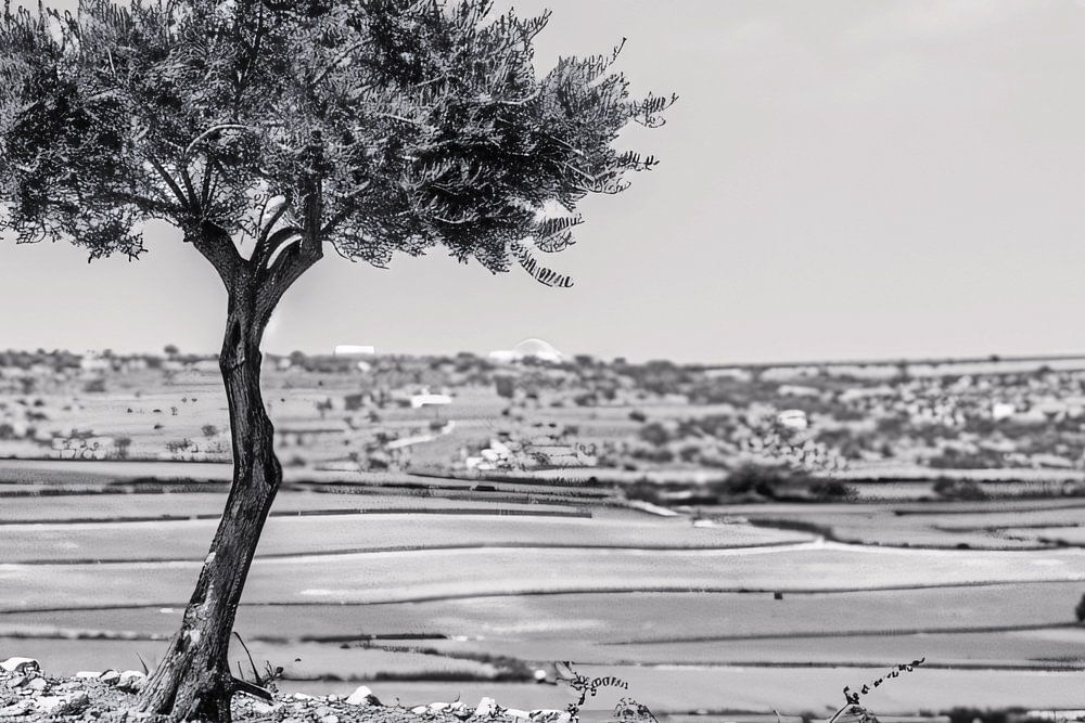Holen Sie sich die Ruhe der Natur ins Haus mit diesem schönen Foto eines einsamen Baumes in einem Feld. Perfekt für Ihr Schlafzimmer oder Büro.
