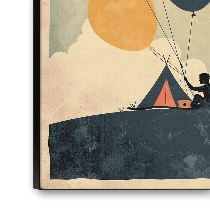 Lassen Sie Ihrer Fantasie freien Lauf mit diesem verträumten Motiv. Eine einsame Figur sitzt neben ihrem Zelt, bereit für ein Abenteuer, aber ihr Blick ist auf die bunten Ballons gerichtet, die sie in den Himmel ziehen. Die sanften Vintage-Farben und das minimalistische Design machen dieses Kunstwerk perfekt für jeden Raum, der einen Hauch von Nostalgie und Wunder braucht. Lassen Sie sich in eine Welt der Träume und Möglichkeiten entführen.