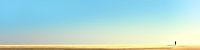 Diese minimalistische Darstellung im Langformat zeigt einen leeren sandigen Horizont unter einem blauen Himmel, wobei eine winzige schwarze Silhouette einer Person steht. Die reduzierten Elemente vermitteln ein Gefühl der Weite und Einsamkeit. Der leere sandige Horizont symbolisiert unendliche Möglichkeiten und Raum für Reflexion,…
