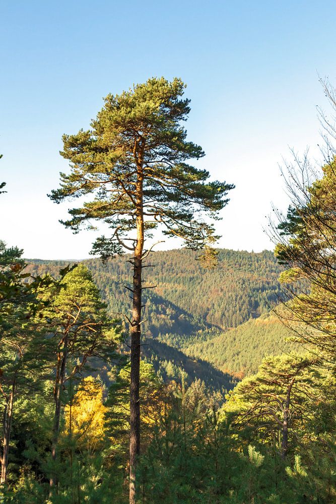 Einzelne Kiefer steht auf einem Berg mit weitem Blick auf ein Tal vor einer Bank