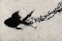 Ein ausdrucksstarkes Tuschegemälde, das einen einzelnen Fisch beim Schwimmen zeigt. Der Fisch ist eine dunkle, organische Masse, hinter der sich eine Spur aus zarten Blasen und verspritzten Tintentropfen zieht, die auf einem strukturierten weißen Hintergrund die fließende Bewegung durch das Wasser vermitteln.
