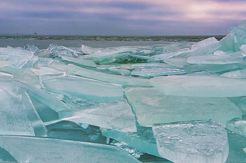 Zerkleinerndes Eis entlang des Afsluitdijk. Diese Fotos wurden am 17. Februar 2021 in der Nähe von Breezand aufgenommen. Der kurze Winter ist vorbei.