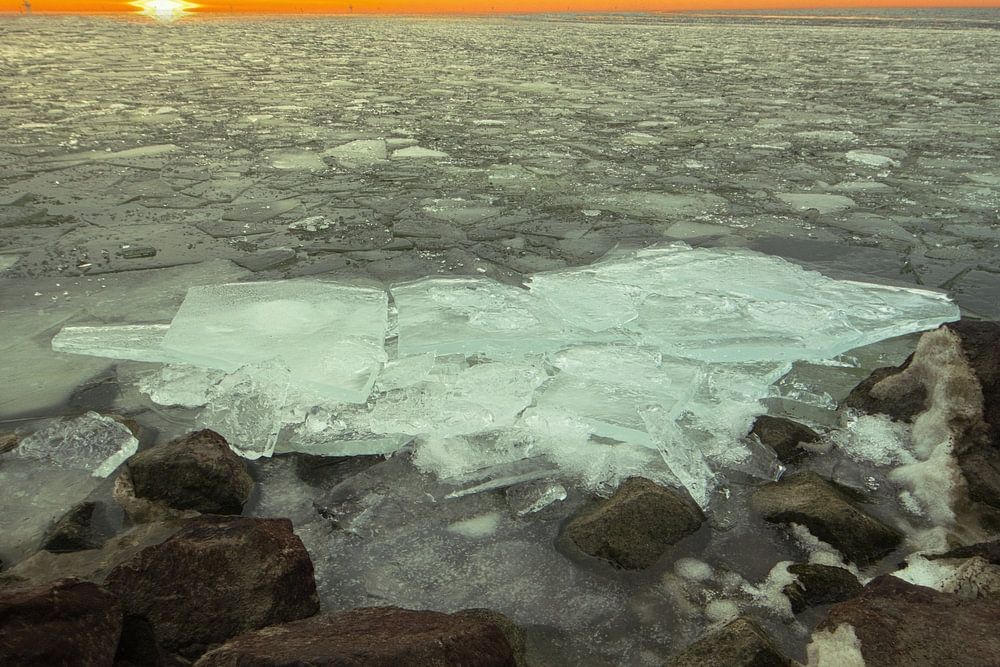 Zerkleinerndes Eis entlang des Afsluitdijk. Diese Fotos wurden am 17. Februar 2021 in der Nähe von Breezand aufgenommen. Der kurze Winter ist vorbei.