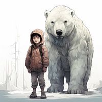 Ein Porträt eines kleinen Jungen, der neben seinem Freund, dem Eisbären, steht. Die beiden stehen in einer Winterlandschaft. Der Druck hat ein quadratisches Format.