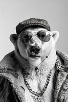 Einzigartiges monochromes Porträt eines Eisbären, stilisiert mit Hut, Kette und Sonnenbrille. Kunstvolle Darstellung eines Tiers in menschlicher Mode.