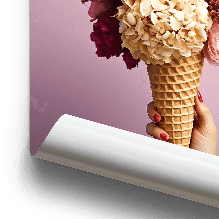 Dieses bezaubernde Bild zeigt eine handgehaltene Eiscreme-Tüte, aus der lebendige Blumen in pastellvioletten Nuancen erblühen. Ein Bild, das die Sinne verführt und die Vorstellungskraft beflügelt – perfekt, um Ihrem Raum eine…