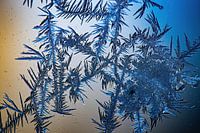 Eisblumen auf dem Fenster, mit der Sonne dahinter.