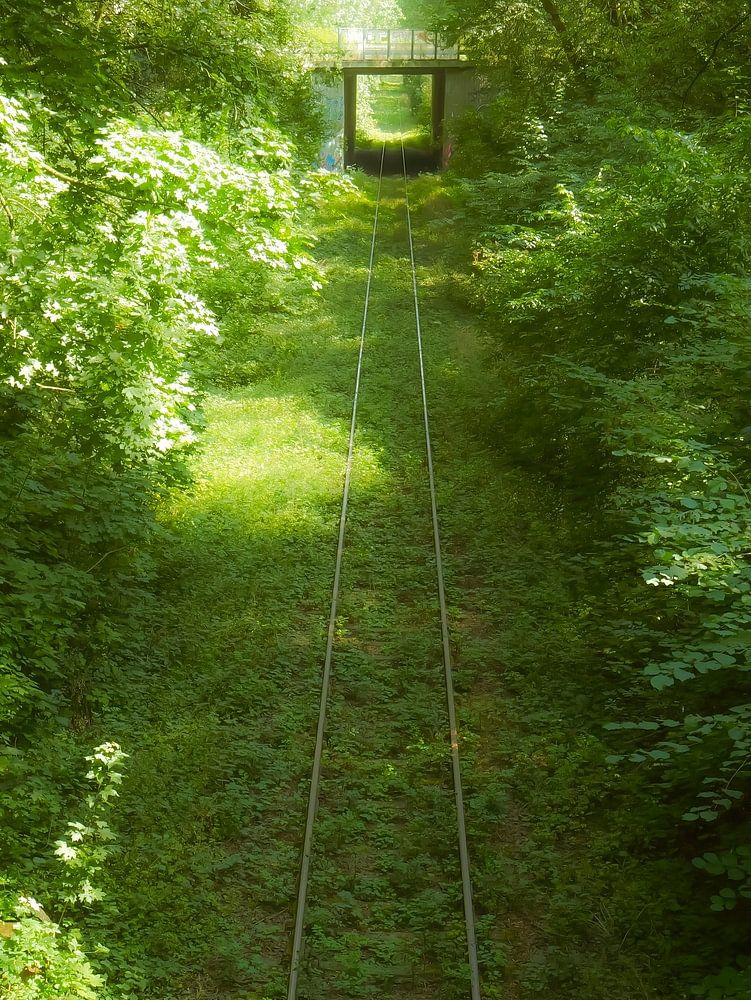 Eine stillgelegte Eisenbahnstrecke in der Nähe von Vaals mit Tageslicht zwischen den Bäumen.