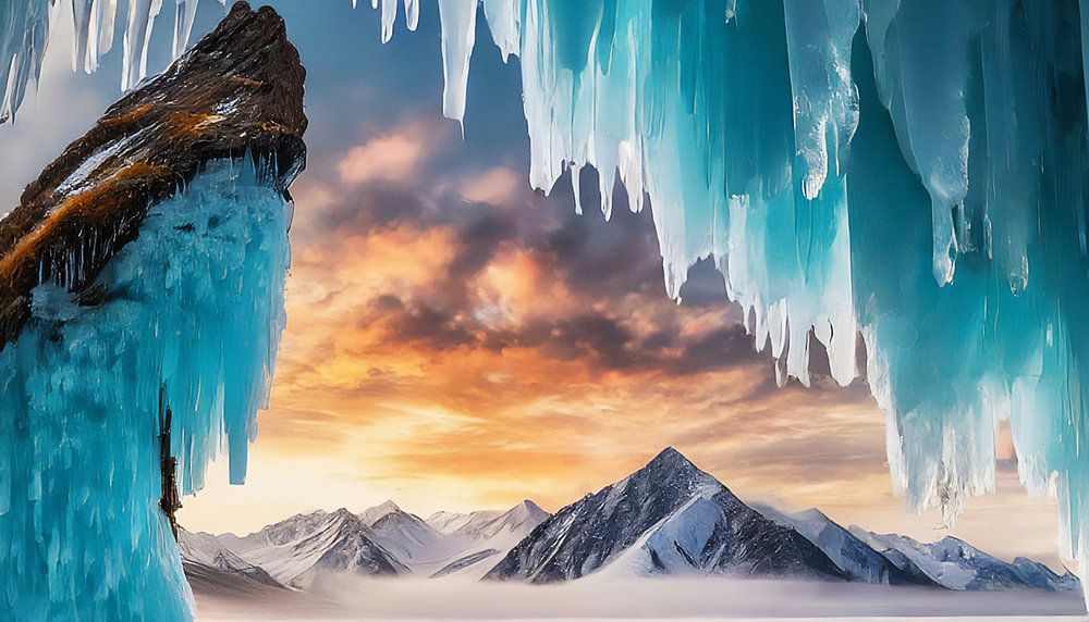 Eishöhle mit Berg und Schnee wie Sonnenuntergang