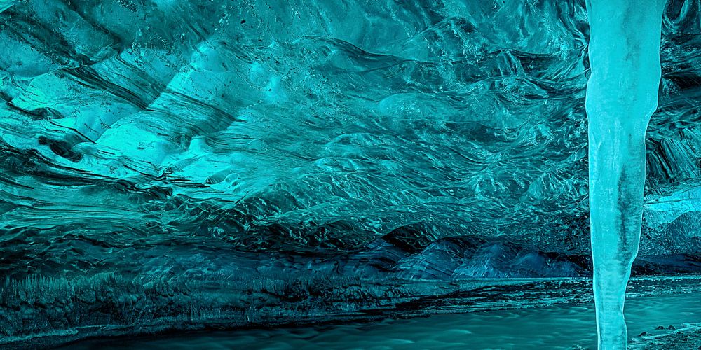 Ein Bach bildet eine Eishöhle unter einem Gletscher in Island und zeigt die unerbittliche Kraft der Natur, sich zu verwandeln