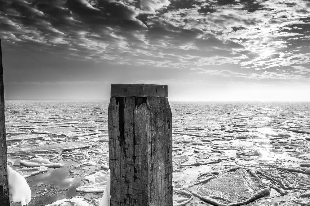Ein herrlicher Wintertag im Ostseebad Scharbeutz ( bei Timmendorfer Strand ). Die Badeleiter und die Dalben ( Duckdalben ) gehören zu der alten Seebrücke von Scharbeutz.