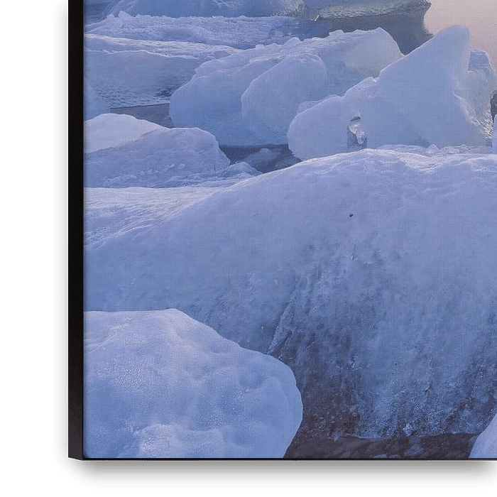 Eisschollen auf dem Jökulsarlon-See in Island bei Sonnenuntergang mit einer schönen Spiegelung im Wasser und abendlichen Rottönen am Himmel.