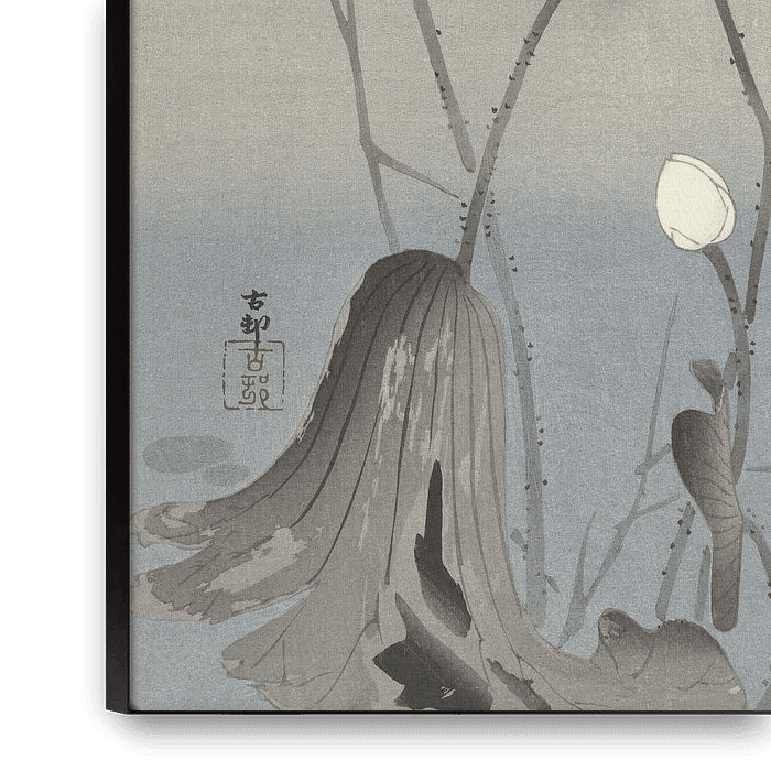 Bestelle Eisvogel sitzend auf gebogenem Stiel in der Nähe der weißen Lotusblume von Ohara Koson als Reproduktion auf Leinwand, Alu-Dibond, als Poster, Fototapete oder Acrylglasbild.