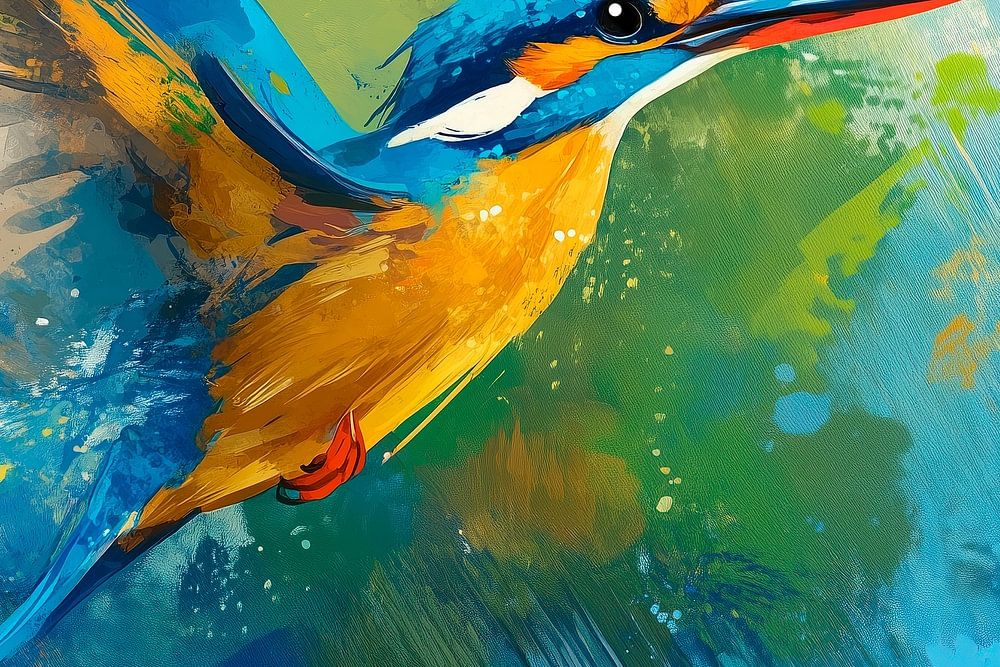 Abstraktes, farbenfrohes Bild eines Eisvogels, der ins Wasser taucht. Ein dynamisches und farbenfrohes Bild.
