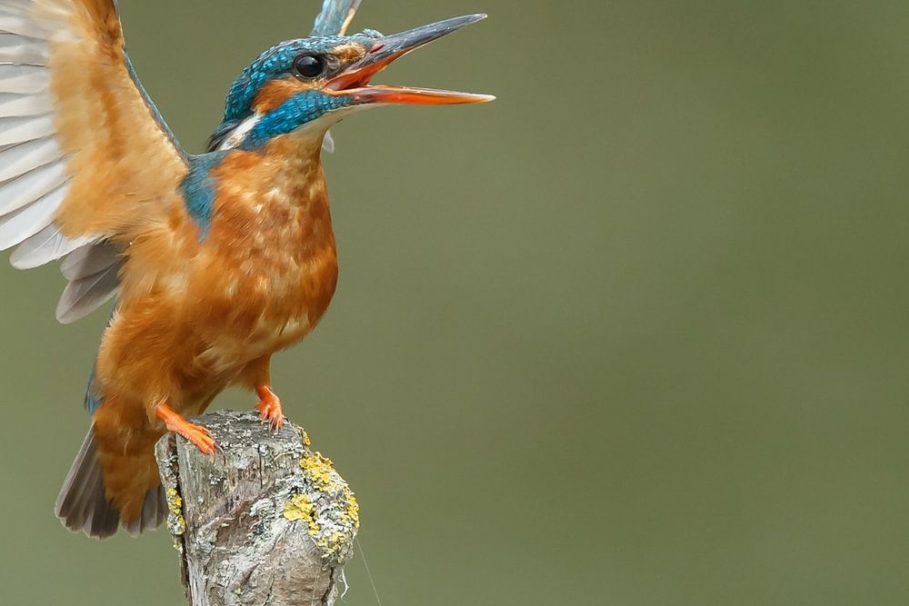 Ein Eisvogel mit voll geöffneten Flügeln und offenem Schnabel auf einem Zweig mit zartgrünem Hintergrund