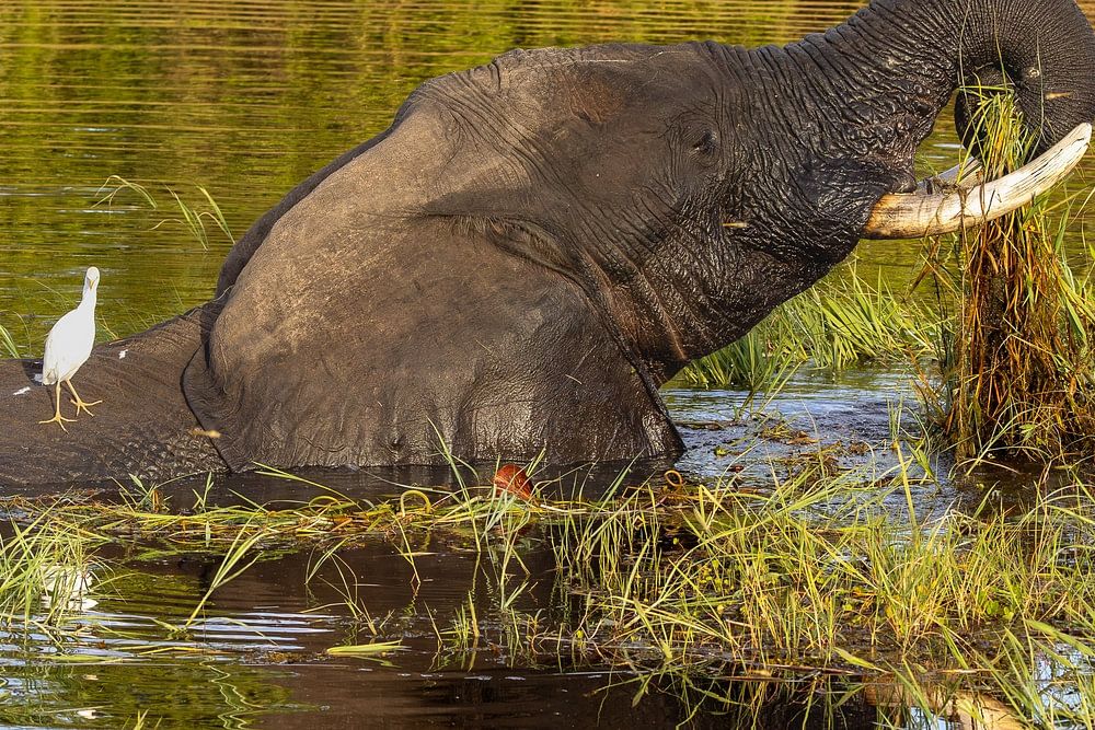 Der Chobe-Fluss in Botswana ist berühmt für seine riesige Elefantenpopulation, die auf etwa 120.000 Tiere geschätzt wird. In der Trockenzeit ziehen die Tiere in großen Gruppen zum Fluss, um zu trinken und zu spielen, wobei sie mit ihren Rüsseln als Schnorchel durch das Wasser waten. Der Chobe-Fluss bietet Safaribesuchern einen spektakulären Anblick, vor allem bei Bootsausflügen, bei denen Elefanten, Büffel, Flusspferde und Krokodile gemeinsam beobachtet werden können.