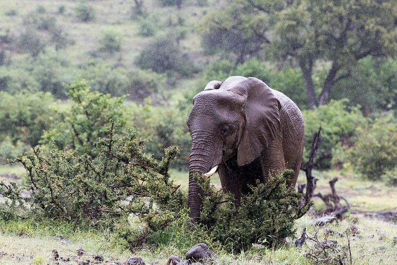 Dieser Elefant stand während eines heftigen Regenschauers bei einem Gebüsch und fraß. Mit einer kurzen Verschlusszeit wurden die Tropfen festgehalten. Man sieht sie auch wirklich als Tropfen. Das zeigt, wie schwer es für Tiere in der Natur ist.
